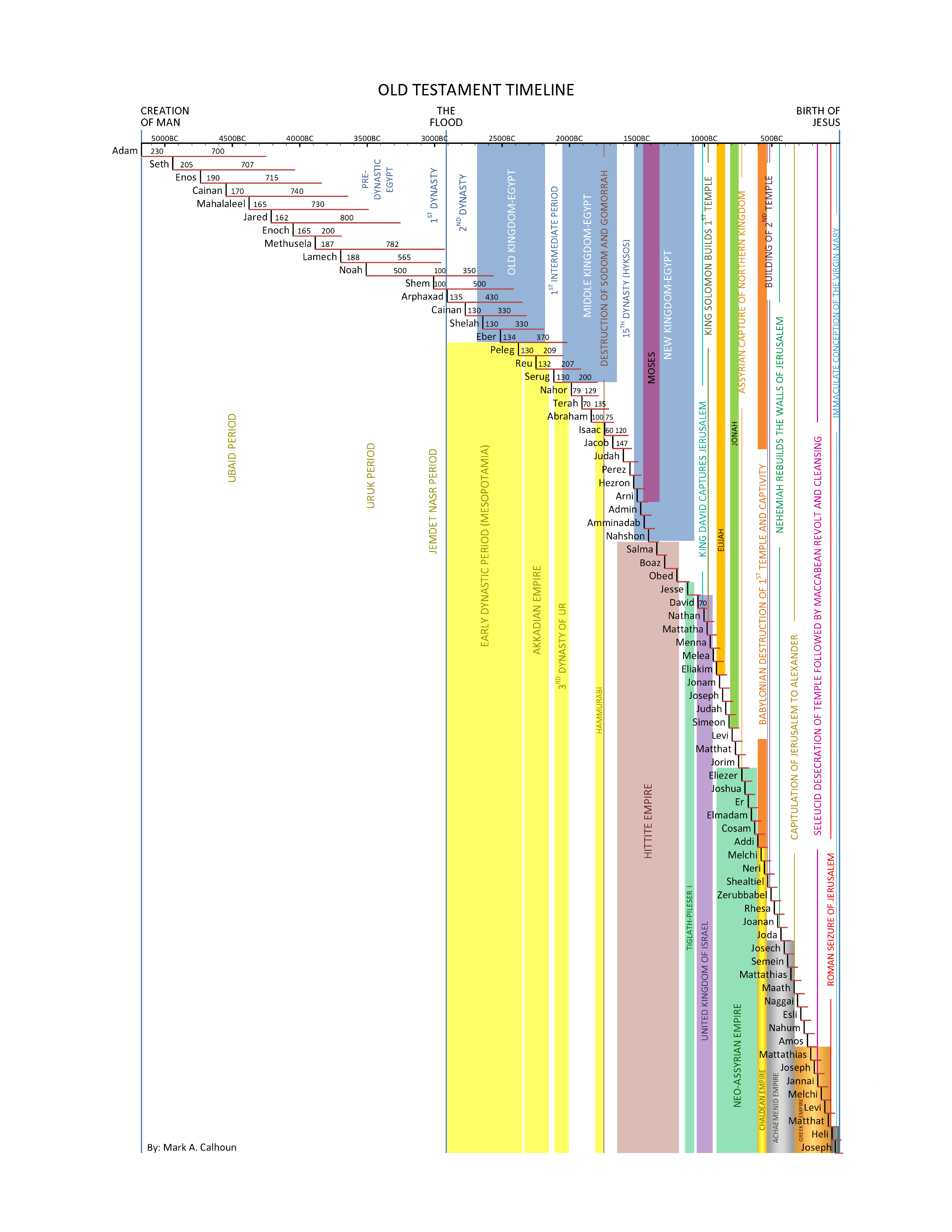 This Old Testament timeline is grounded in the genealogy of our Lord and savior Jesus Christ as found in the gospel of Saint (St.) Luke, beginning with the first man, Adam, and ending with the foster-father of Christ, St. Joseph. The lifespans and begetting ages, where provided, are taken from the Greek Septuagint (hereinafter the “LXX”) a translation into Greek of the mostly-Hebrew Old Testament that was completed by 132 BC (before Christ).1